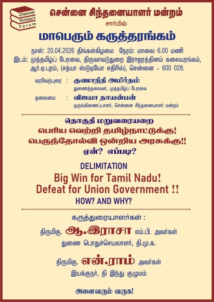 சென்னை சிந்தனையாளர் மன்றம் நேற்று ஏப்ரல் 20-ந் தேதி சென்னையில், ”தொகுதி மறுவரையறை.. பெரிய வெற்றி தமிழ்நாட்டுக்கு! பெருந்தோல்வி ஒன்றிய அரசுக்கு! ஏன் – எப்படி?” என்ற தலைப்பில் கருத்தரங்கம் நடத்தியது.