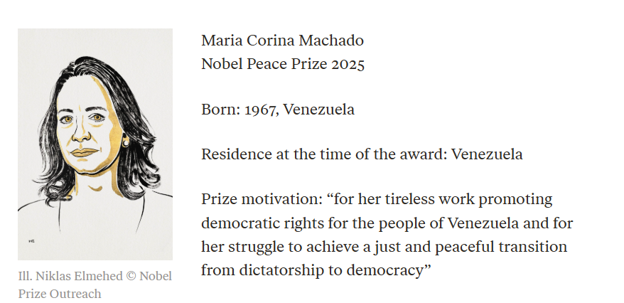 அதன்படி 2025 ஆம் ஆண்டுக்கான அமைதிக்கான நோபல் பரிசானது வெனிசுலா நாட்டைச் சேர்ந்த பெண் போராளியான மரியா கொரினா மச்சாடோவுக்கு வழங்கப்பட்டுள்ளது.
