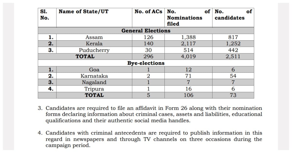 - கேரளாவில் 140 தொகுதிகளுக்கு 2,117 வேட்புமனுக்களும் (1,252 வேட்பாளர்கள்)
