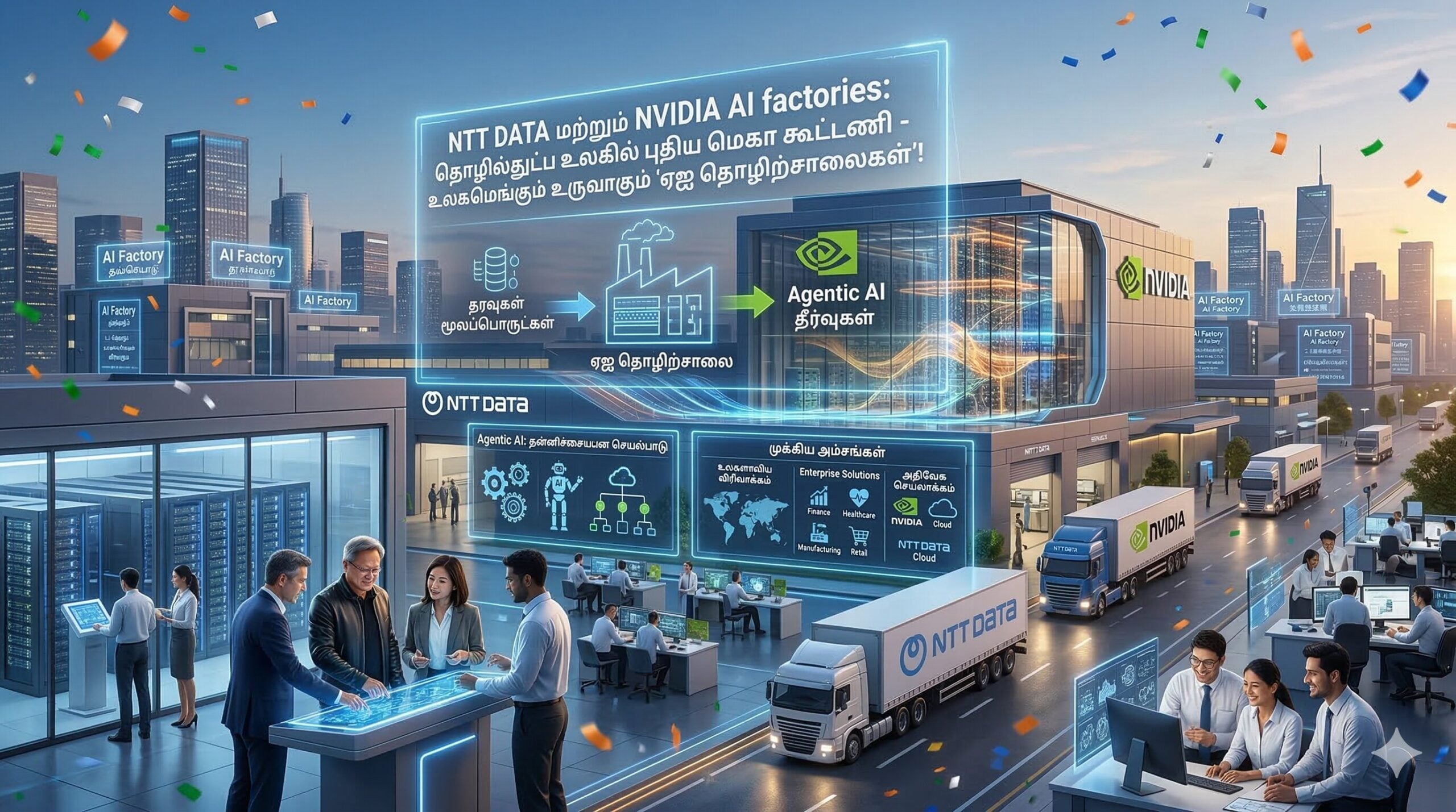 தொழில்நுட்ப உலகம் தற்போது செயற்கை நுண்ணறிவின் (AI) அடுத்த கட்டத்தை நோக்கி மிக வேகமாக நகர்ந்து கொண்டிருக்கிறது. இந்தச் சூழலில், உலகின் முன்னணி தகவல் தொழில்நுட்ப சேவை நிறுவனமான NTT DATA மற்றும் சிப் தயாரிப்பு ஜாம்பவானான NVIDIA இணைந்து ஒரு வரலாற்றுச் சிறப்புமிக்க கூட்டணியை அறிவித்துள்ளன. இந்த NTT DATA and NVIDIA AI factories கூட்டணியானது, உலகளாவிய நிறுவனங்களுக்காக ‘Agentic AI’ தொழில்நுட்பத்தை பெரிய அளவில் கொண்டு செல்வதை நோக்கமாகக் கொண்டுள்ளது. இது வெறும் மென்பொருள் மேம்பாடு மட்டுமல்ல, நிறுவனங்களின் ஒட்டுமொத்த உற்பத்தித் திறனையும், செயல்பாட்டு முறையையும் அடியோடு மாற்றியமைக்கப்போகும் ஒரு பிரம்மாண்டமான ‘ஏஐ தொழிற்சாலை’ (AI Factory) திட்டமாகும்.