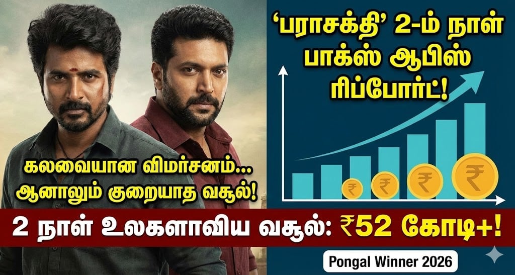 - இரண்டு நாட்கள் முடிவில், உலகளவில் ‘பராசக்தி’ திரைப்படம் ₹52 கோடியை (Gross) தாண்டி வசூலித்துள்ளதாக வர்த்தக வட்டாரங்கள் தெரிவிக்கின்றன.