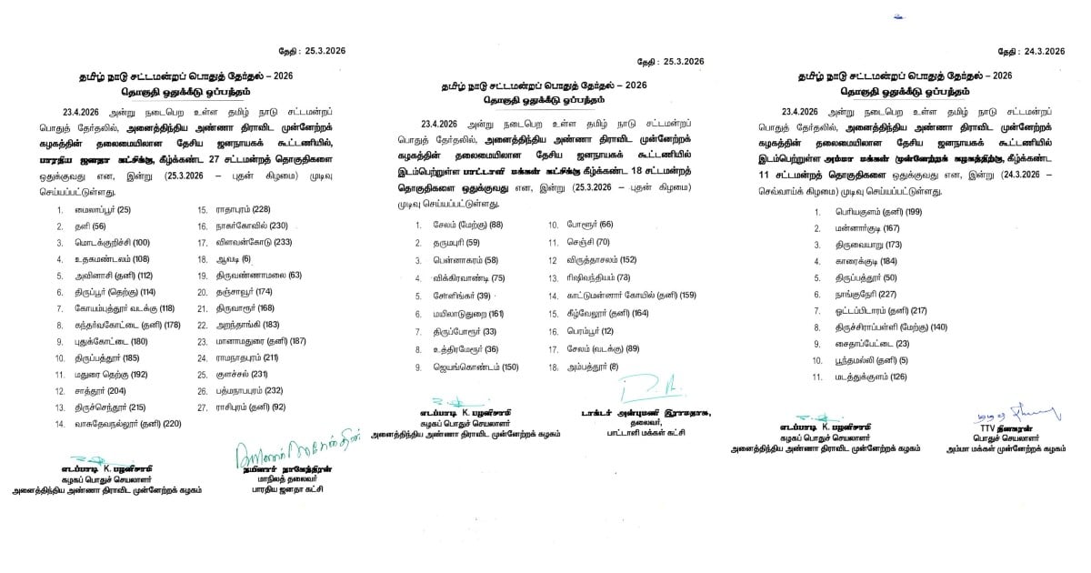 அதிமுக கூட்டணியில் பாஜகவுக்கு 27; பாமக- 18; அமமுக 11; தமாகா 5 இடங்கள் ஒதுக்கப்பட்டுள்ளன. இந்த கட்சிகளுக்கான தொகுதிகளும் இன்று அறிவிக்கப்பட்டுள்ளன.