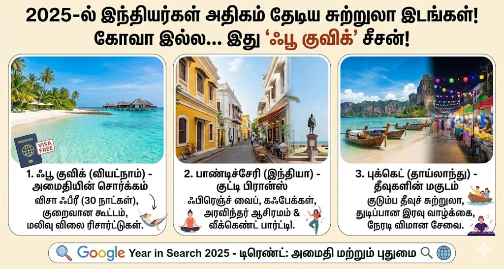 பயணிகள் கவனத்திற்கு: நீங்கள் அடுத்த ட்ரிப் பிளான் செய்கிறீர்கள் என்றால், கூட்ட நெரிசல் மிகுந்த கோவாவைத் தவிர்த்துவிட்டு, விசா தலைவலி இல்லாத ஃபூ குவிக் அல்லது பட்ஜெட்டிற்கு ஏற்ற பாண்டிச்சேரியை டிக் செய்யலாம். 2025-ன் டிரெண்டே ‘அமைதி மற்றும் புதுமை’ தான்!