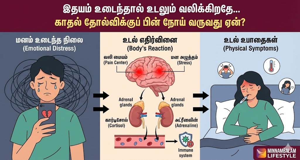 காதல் தோல்வி அல்லது விவாகரத்து என்பது ஒருவரது வாழ்க்கையில் மிக மோசமான மன அழுத்தத்தைத் தரும் நிகழ்வு. “நெஞ்சம் வலிக்குது” என்று கவித்துவமாகச் சொன்னாலும், உண்மையில் பலருக்குப் பிரிவிற்குப் பிறகு காய்ச்சல், உடல் வலி, நெஞ்சு எரிச்சல் போன்ற உடல் ரீதியான உபாதைகள் ஏற்படுவதைக் கவனித்திருப்போம். இது ஏன் நடக்கிறது? இது வெறும் பிரமை தானா? இல்லை, இதற்குப் பின்னால் ஒரு பெரிய அறிவியலே இருக்கிறது.