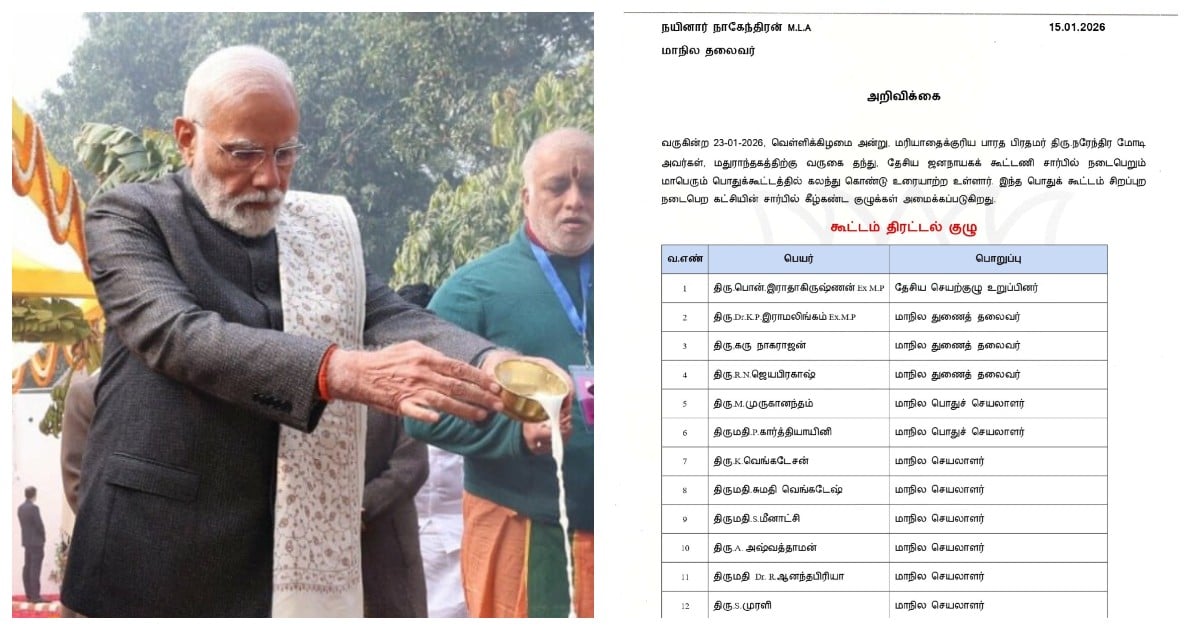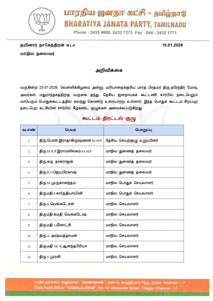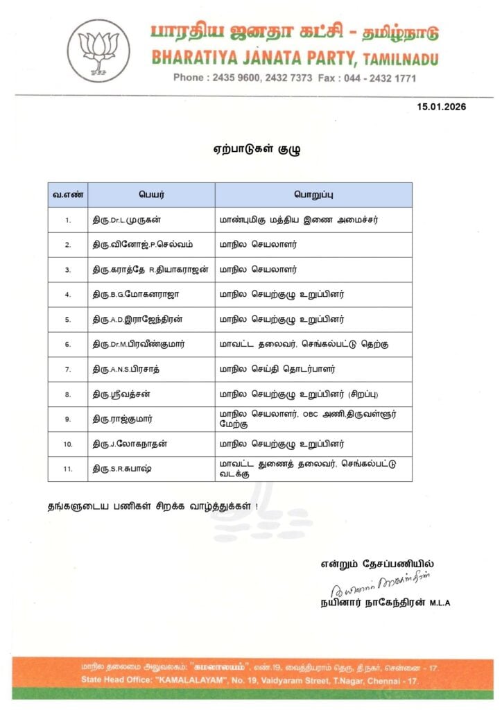 அதேபோல மத்திய இணை அமைச்சர் எல்.முருகன், மாநில செயலாளர் கராத்தே தியாகராஜன் உள்ளிட்ட 11 பேர் கொண்ட ‘ஏற்பாடுகள் குழு’வையும் நயினார் நாகேந்திரன் அறிவித்துள்ளார்.