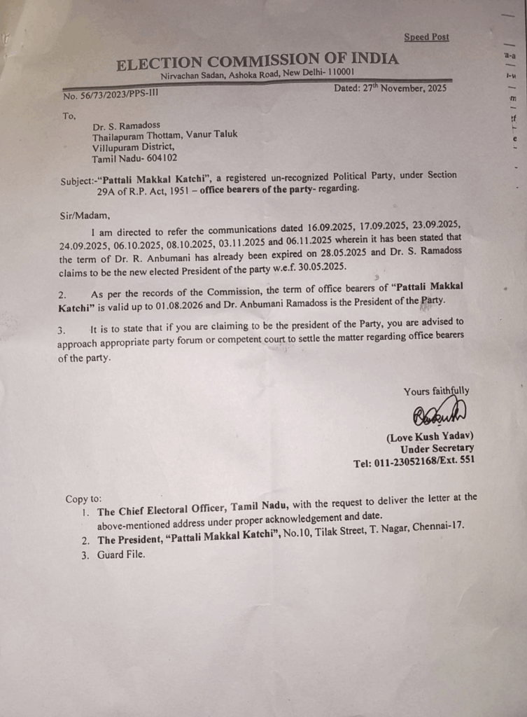 ராமதாஸுக்கு தேர்தல் ஆணையம் அனுப்பிய கடிதத்தில், 2026 ஆம் ஆண்டு ஆகஸ்ட் 1ஆம் தேதி வரை அன்புமணி தான் பாமகவின் தலைவர். அக்கட்சி நிர்வாகிகள் அன்புமணியை தான் தலைவராக தேர்வு செய்துள்ளனர் அதற்கான தரவுகள் உள்ளன என்று தெரிவித்துள்ளது.