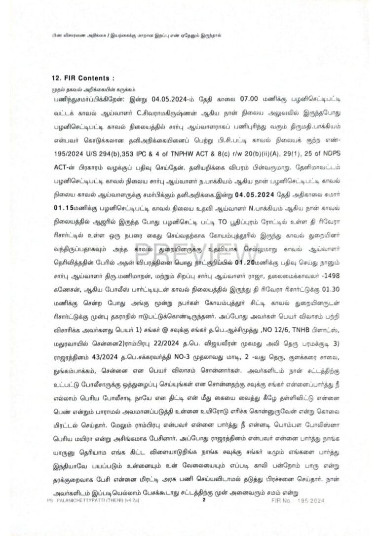 “இன்று 04.05.2024-ம் தேதி காலை 07.00 மணிக்கு பழனிசெட்டிபட்டி வட்டக் காவல் ஆய்வாளர் C.சிவராமகிருஷ்ணன் ஆகிய நான் நிலைய அலுவலில் இருந்தபோது பழனிசெட்டிபட்டி காவல் நிலையத்தில் சார்பு ஆய்வாளராகப் பணிபுரிந்து வரும் பாக்கியம் என்பவர் கொடுக்கலான தனிஅறிக்கையினைப் பெற்று பி.சி.பட்டி காவல் நிலையக் குற்ற எண்- 195/2024 U/S 294(b),353 IPC & 4 of TNPHW ACT & 8(c) r/w 20(b)(ii)(A), 29(1), 25 of NDPS ACT-ன் பிரகாரம் வழக்குப் பதிவு செய்தேன்.