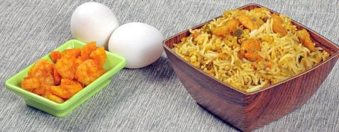 சுத்தம் செய்த இறாலை ஒரு டீஸ்பூன் மிளகாய்த்தூள், மஞ்சள் தூள், சிறிது உப்பு சேர்த்து அரை மணி நேரம் பிசிறி வைக்கவும். பிறகு, ஒரு வாணலியில் எண்ணெய்விட்டு கறிவேப்பிலை, நறுக்கிய பச்சை மிளகாய், பொடியாக நறுக்கிய பெரிய வெங்காயம் சேர்த்து நன்கு வதக்கவும். இத்துடன் இஞ்சி-பூண்டு விழுது சேர்த்து, பச்சை வாசனை போக வதக்கி, பிசிறிவைத்த இறால் கலவையும் சேர்த்து வதக்கவும். பிறகு கரம் மசாலாத்தூள், மீதமுள்ள மிளகாய்த்தூள் சேர்த்து நன்கு வதக்கி, 10 நிமிடங்கள் தீயைக் குறைத்து இறாலை வேக விடவும். இறால் வெந்ததும் முட்டையை உடைத்து ஊற்றி, முட்டைக்குத் தேவையான உப்பு மட்டும் சேர்த்து முட்டையை இறாலுடன் சேர்த்து நன்கு கலக்கிவிட்டு வேகவிடவும். பிறகு, இறக்கி வேகவைத்து ஆற வைத்த சாதத்துடன் கலந்து மல்லித்தழை தூவிப் பரிமாறவும். தேவைப்பட்டால், மிளகுத்தூள் சேர்த்துக் கொள்ளலாம்.