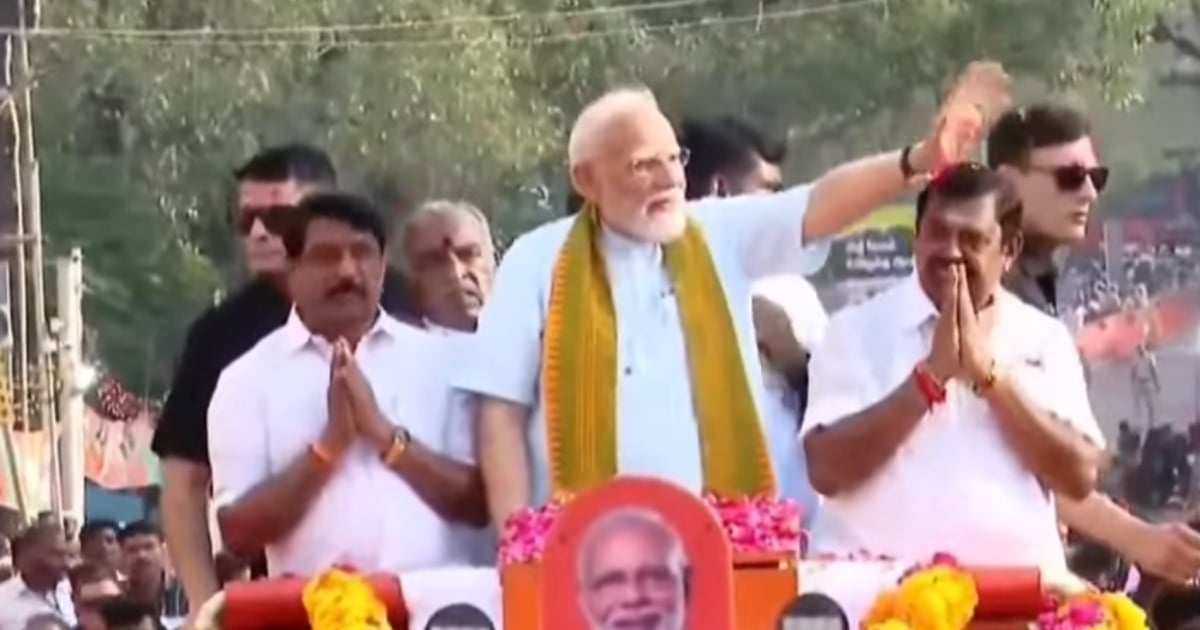 மோடியின் பிரச்சார வாகனத்தில் அதிமுக பொதுச் செயலாளர் எடப்பாடி பழனிசாமி, பாஜக மாநிலத் தலைவர் நயினார் நாகேந்திரன், முன்னாள் மாநிலத் தலைவர் அண்ணாமலை, பொன். ராதாகிருஷ்ணன் உள்ளிட்டோர் இருந்தனர்.