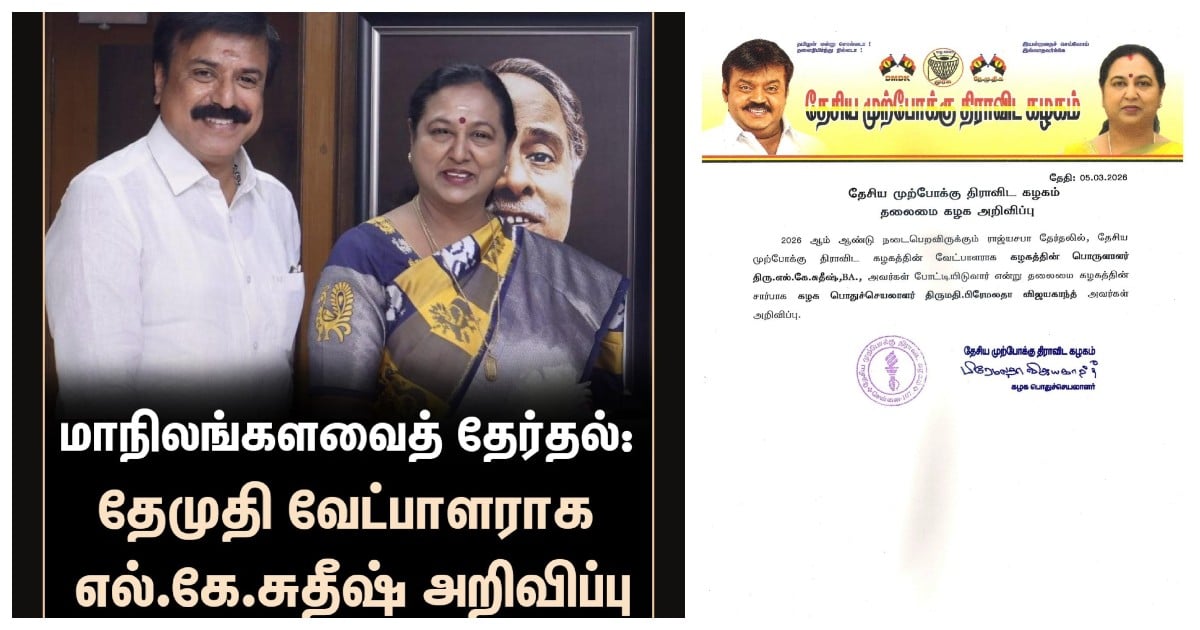 மாநிலங்களவைத் தேர்தலில் தேமுதிக வேட்பாளராக எல்.கே.சுதீஷ் (L.K. Sudhish) போட்டியிடுவார் என அக்கட்சியின் பொதுச்செயலாளர் பிரேமலதா விஜயகாந்த் அறிவித்துள்ளார்.