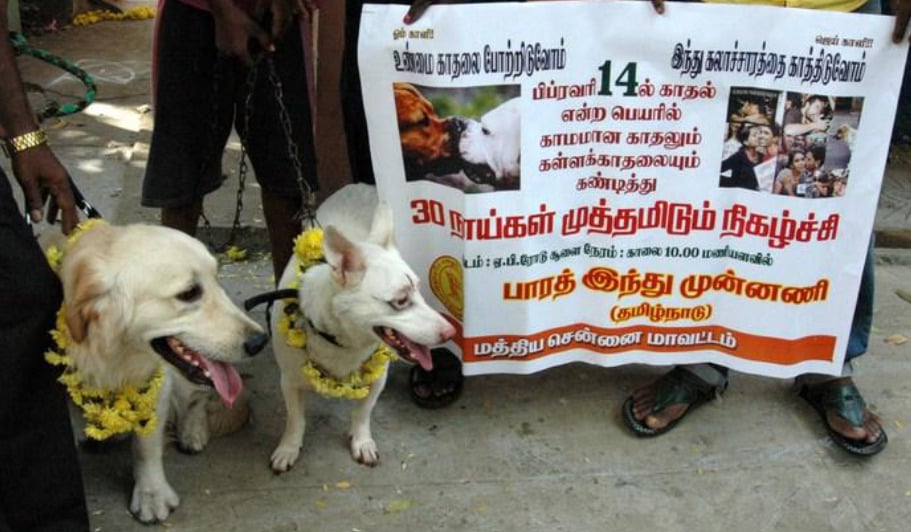 காதலர் தினத்திற்கு எதிர்ப்பு தெரிவித்து இந்து அமைப்புகள் பிப்ரவரி 14-ஆம் தேதி பூங்கா, கடற்கரை உள்ளிட்ட இடங்களில் போராட்டம் நடத்துவது, நாய்களுக்கு திருமணம் செய்து வைப்பது, , கழுதைகளுக்கு திருமணம் செய்து வைப்பது போன்ற நூதன முறையில் போராட்டம் நடத்துவார்கள்.