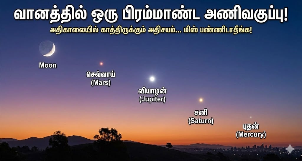 என்ன தெரியும்? இந்த “பிளானட் பரேட்” நிகழ்வின் போது, புதன் (Mercury), செவ்வாய் (Mars), வியாழன் (Jupiter), சனி (Saturn) போன்ற கிரகங்கள் நிலவுடன் இணைந்து வானில் ஒரு வில் போன்ற வடிவத்திலோ அல்லது நேர்கோட்டிலோ தோன்றும்.