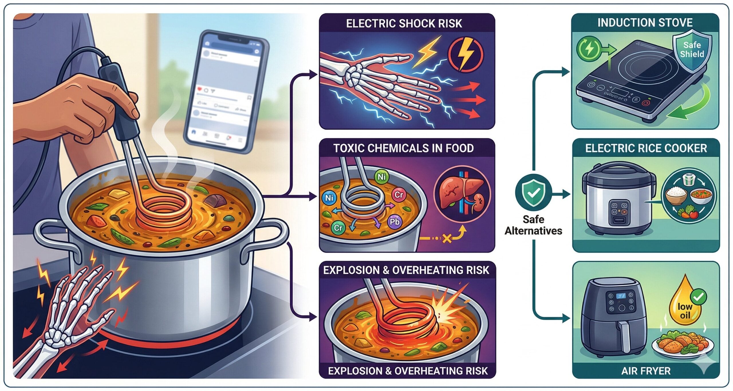 சிக்கனம் என்ற பெயரில் நம் உயிரையும், நம் குடும்பத்தின் ஆரோக்கியத்தையும் பணயம் வைப்பது புத்திசாலித்தனம் அல்ல. இந்த ‘இம்மெர்ஷன் ராட்’ சமையல் முறையைத் தயவுசெய்து யாரும் வீட்டில் முயற்சி செய்ய வேண்டாம் என மருத்துவர்களும் மின்சார வாரிய அதிகாரிகளும் அறிவுறுத்துகின்றனர்.