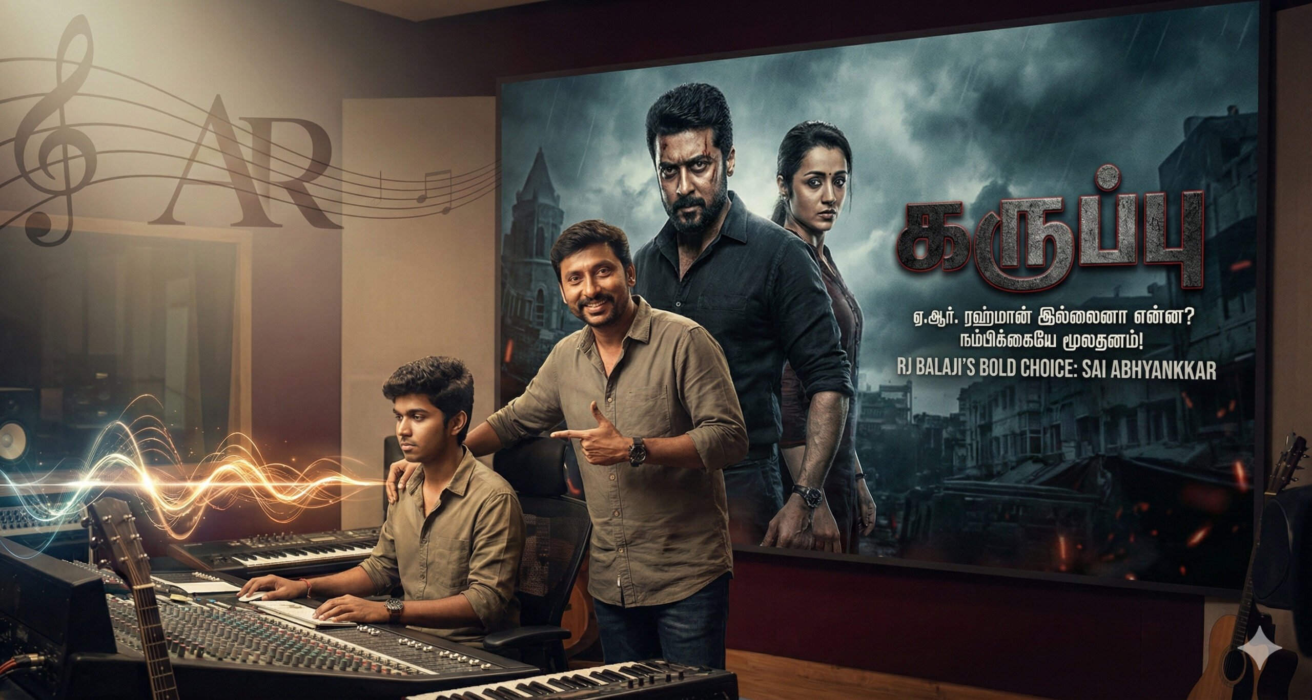 திரையுலகில் ஒரு பழமொழி உண்டு, “திறமை என்பது பூட்டி வைத்தாலும் நறுமணமாக வெளியே வரும்” என்று. ஆனால், அந்த நறுமணத்தை அடையாளம் காண ஒரு தீர்க்கமான பார்வை வேண்டும். சூர்யாவின் நடிப்பில் உருவாகி வரும் ‘கருப்பு‘ (Karuppu) திரைப்படத்தின் இசைப்பணிகள் குறித்து ஆர்.ஜே. பாலாஜி பகிர்ந்துள்ள தகவல்கள், ஒரு இயக்குநரின் தன்னம்பிக்கை எப்படி ஒரு இளம் கலைஞனின் வாழ்க்கையையே மாற்றும் என்பதற்குச் சான்றாக அமைந்துள்ளது.