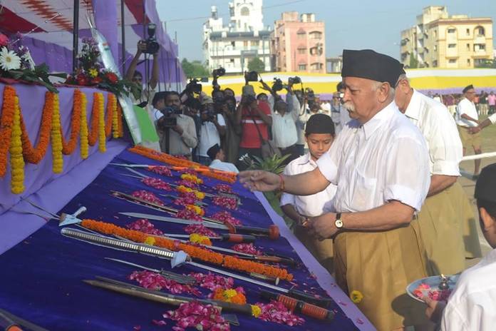 ஆர்.எஸ்.எஸ்.அமைப்பின் சார்பில் இன்று (அக்டோபர் 8) ஆம் தேதி அதன் தலைமையிடமான நாக்பூரில் விஜயதசமி கொண்டாட்டம் நடைபெற்றது. கத்தி, வாள்களை வைத்து ஆயுத பூஜை நடத்தப்பட்டது.