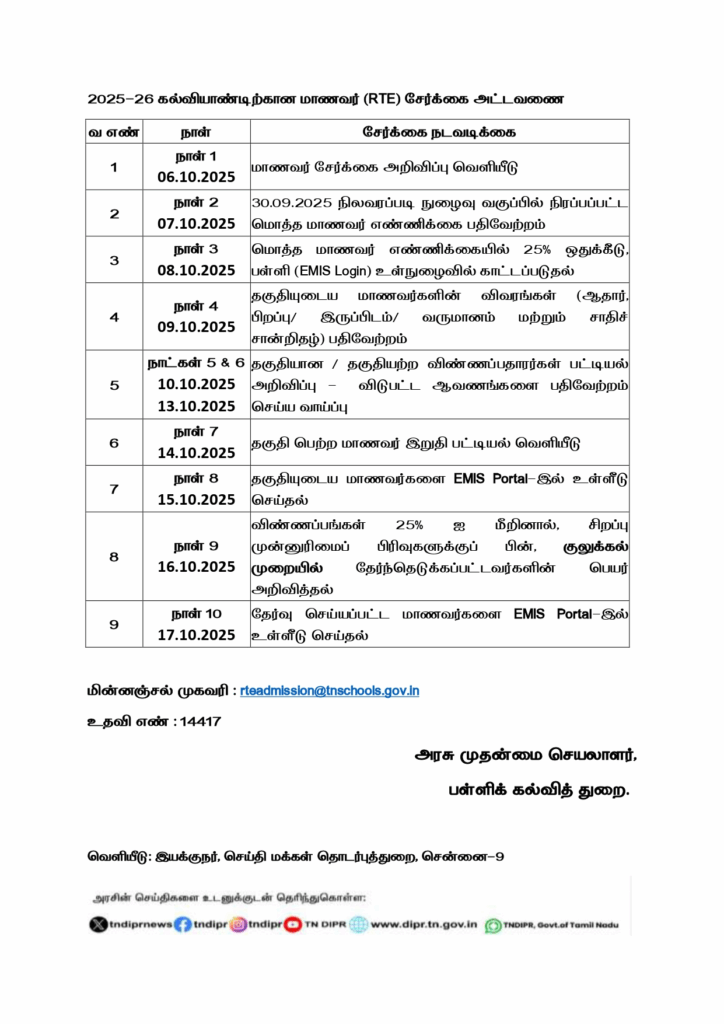 தமிழகத்தில் இலவச மற்றும் கட்டாயக் கல்வி உரிமைச் சட்டம், 2009 (RTE Act) -இன் கீழ் 2025–26 கல்வியாண்டிற்கான மாணவர் சேர்க்கைக்கான அறிவிப்பை தமிழக அரசு வெளியிட்டுள்ளது.
