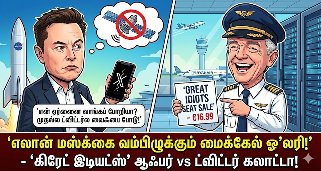 உலகப் பணக்காரர் எலான் மஸ்க் (Elon Musk) எப்போதுமே ட்விட்டரில் (தற்போது X) ஏதாவது சர்ச்சையைக் கிளப்புவார். ஆனால், இம்முறை அவர் மோதியிருப்பது அயர்லாந்தைச் சேர்ந்த பட்ஜெட் ஏர்லைன்ஸ் ஜாம்பவானான ‘ரயன்ஏர்’ (Ryanair) நிறுவனத்தின் சி.இ.ஓ மைக்கேல் ஓ’லரியுடன் (Michael O’Leary). இந்த இரண்டு கார்ப்பரேட் “வாயாடி”களுக்கும் இடையே நடக்கும் வார்த்தைப் போர் இப்போது இணையத்தில் செம வைரல்!