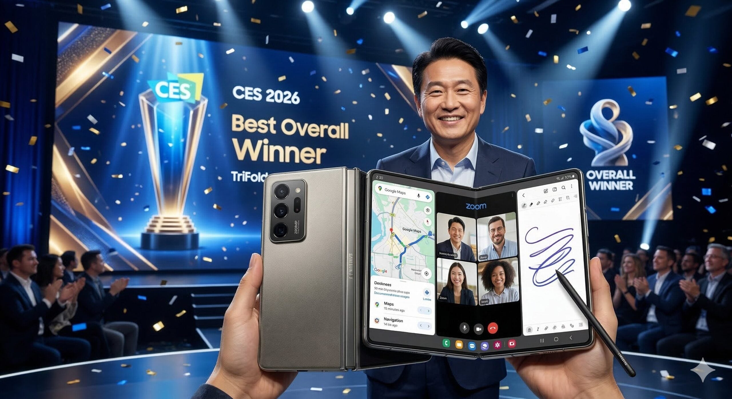 தொழில்நுட்ப உலகின் மிகப்பெரிய திருவிழாவான CES 2026 (Consumer Electronics Show) சமீபத்தில் லாஸ் ஏஞ்சல்ஸ் நகரில் நிறைவடைந்தது. இந்த விழாவில் ஆயிரக்கணக்கான புதிய கண்டுபிடிப்புகள் அறிமுகமானாலும், ஒட்டுமொத்த உலகின் கவனத்தையும் ஈர்த்து ‘Best Overall Winner’ என்ற உயரிய விருதைத் தட்டிச் சென்றுள்ளது சாம்சங் நிறுவனத்தின் Samsung Galaxy Z TriFold. இது வெறும் ஸ்மார்ட்போன் மட்டுமல்ல, உங்கள் பாக்கெட்டில் அடங்கும் ஒரு 10-இன்ச் டேப்லெட் ஆகும். மடிக்கக்கூடிய போன் (Foldable) சந்தையில் சாம்சங் மீண்டும் ஒரு புதிய வரலாற்றைப் படைத்துள்ளது.
