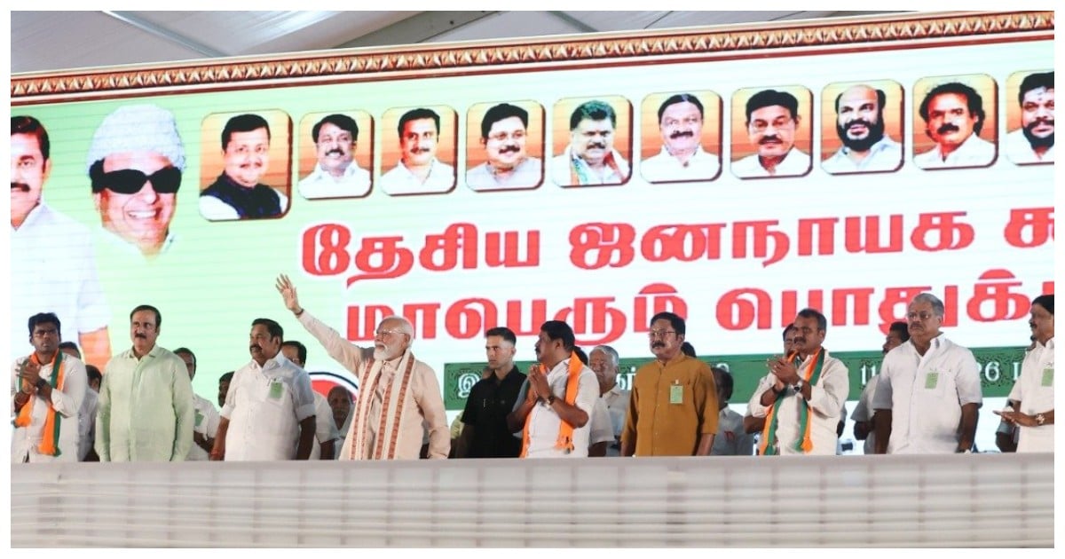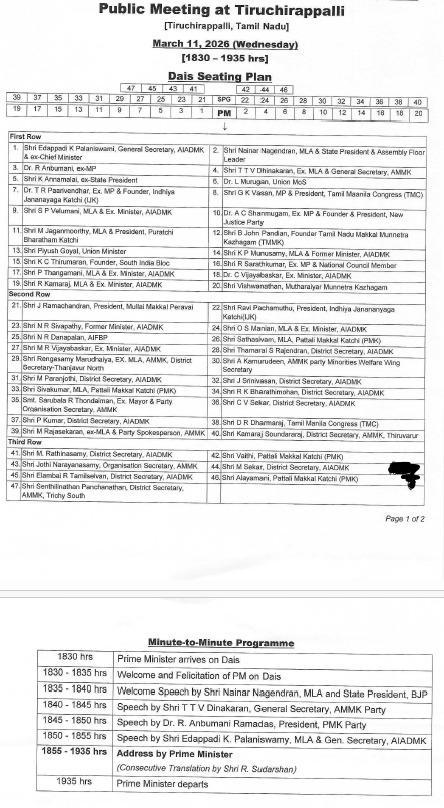 திருச்சியில் நேற்று மார்ச் 11-ந் தேதி பிரதமர் மோடி பங்கேற்ற தேசிய ஜனநாயகக் கூட்டணியின் பிரசார பொதுக் கூட்டம் நடந்தது. இந்த பொதுக் கூட்ட மேடையில் பாஜக, அதிமுக உள்ளிட்ட தேசிய ஜனநாயகக் கூட்டணியின் அனைத்து கட்சி தலைவர்களும் பங்கேற்றனர்.