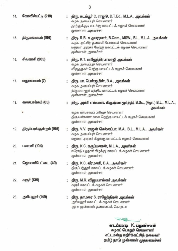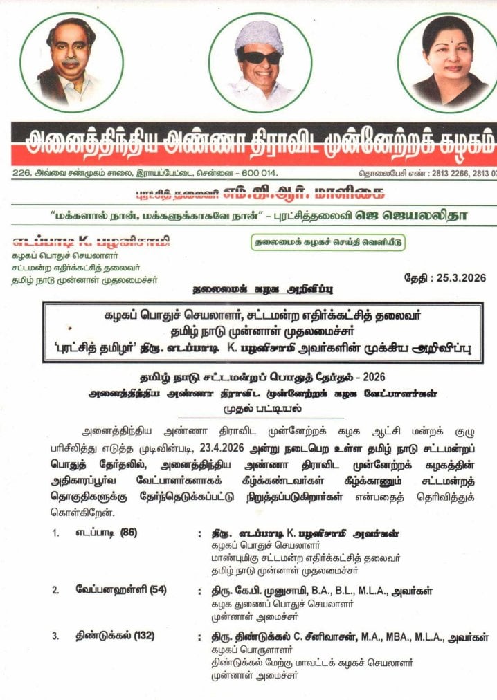 தமிழகத்தில் நடைபெறவுள்ள 2026 சட்டப்பேரவைத் தேர்தலை முன்னிட்டு, அனைத்திந்திய அண்ணா திராவிட முன்னேற்றக் கழகத்தின் முதற்கட்ட வேட்பாளர் பட்டியலை அக்கட்சியின் பொதுச்செயலாளர் எடப்பாடி பழனிசாமி இன்று (மார்ச் 25) வெளியிட்டுள்ளார்.