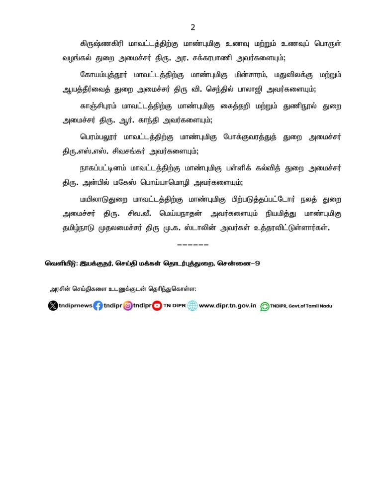 இந்த நிலையில் தமிழ்நாட்டில் மாவட்ட வளர்ச்சிப் பணிகளைத் துரிதப்படுத்தவும், பொது மக்களுக்குச் சென்றடைய வேண்டிய நலத்திட்ட உதவிகளைக் கண்காணிக்கவும், இயற்கைச் சீற்றம், நோய்த்தொற்று இன்னபிற நேரங்களில் அவசரகாலப் பணிகளைக் கூடுதலாக மேற்கொள்ளவும் அமைச்சர்கள் இல்லாத மாவட்டங்களுக்கு பொறுப்பு அமைச்சர்களை நியமித்து முதலமைச்சர் ஸ்டாலின் உத்தரவிட்டுள்ளார்.