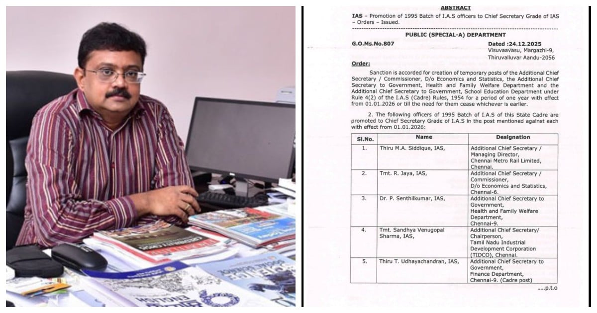 - பள்ளி கல்வித் துறை செயலாளர் சந்திரமோகன் ஆகிய 1995-ம் ஆண்டு பேட்ச் ஐ.ஏ.எஸ். அதிகாரிகளுக்கு 2026-ம் ஆண்டு ஜனவரி 1-ந் தேதி முதல் ‘தலைமைச் செயலாளர்’ அந்தஸ்தில் ’கூடுதல் தலைமைச் செயலாளர்களாக’ பதவி உயர்வு அளிக்கப்பட்டுள்ளது.