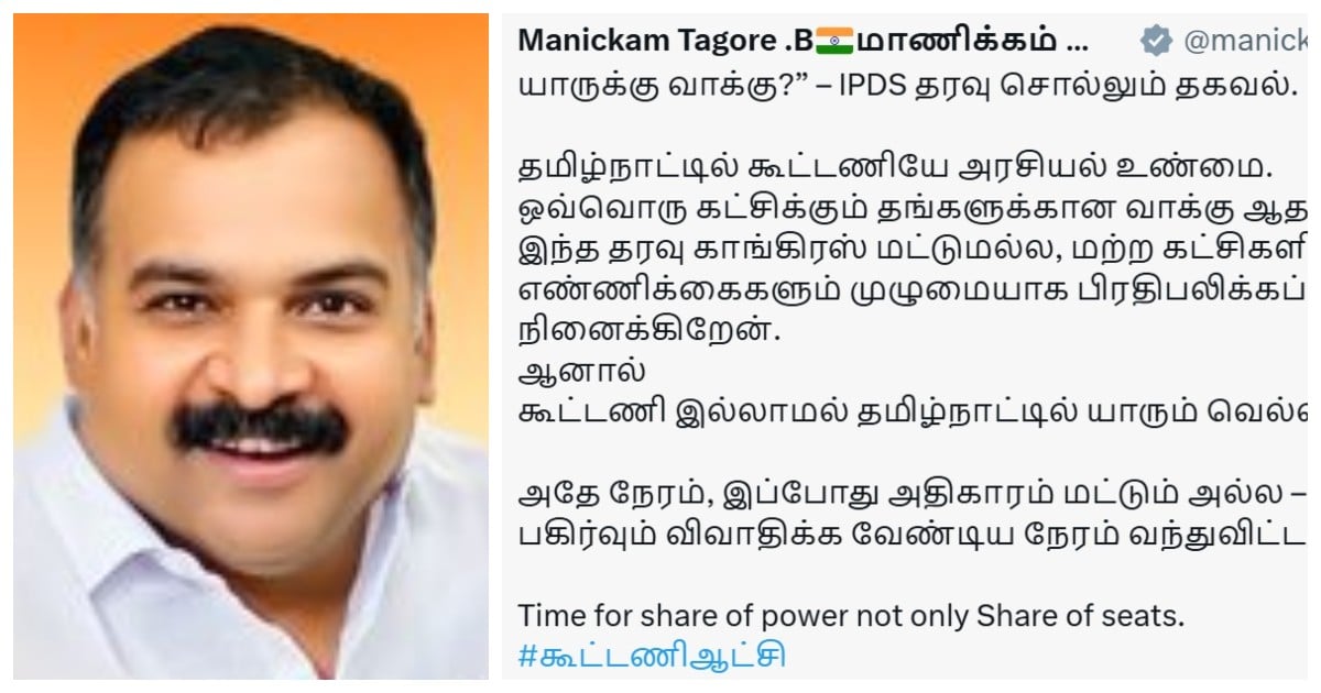 இந்த பின்னணியில் காங்கிரஸ் எம்.பி. மாணிக்கம் தாகூர், IPDS என்ற நிறுவனம் வெளியிட்ட கருத்து கணிப்பு விவரம் ஒன்றை தமது எக்ஸ் பக்கத்தில் ஷேர் செய்துள்ளார்.