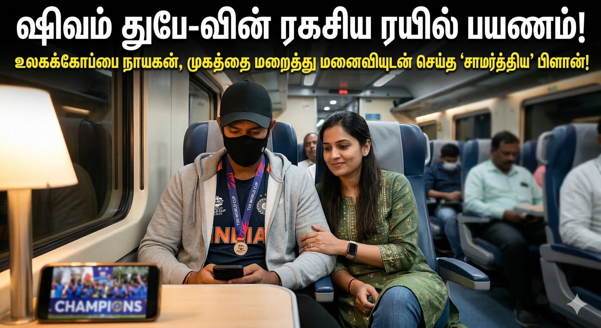 இந்திய கிரிக்கெட் அணி டி20 உலகக்கோப்பையை (T20 World Cup) வென்று நாடு திரும்பியபோது, ஒட்டுமொத்த தேசமே கொண்டாட்டத்தில் மூழ்கியிருந்தது. ஒவ்வொரு வீரரும் ஒரு சூப்பர் ஸ்டாராகப் பார்க்கப்பட்ட நிலையில், அதிரடி ஆட்டக்காரர் ஷிவம் துபே (Shivam Dube) யாருக்கும் தெரியாமல் ரயிலில் பயணம் செய்த செய்தி இப்போது வைரலாகி வருகிறது. இந்த Shivam Dube’s Secret Train Journey குறித்து பல சுவாரஸ்யமான தகவல்கள் வெளியாகியுள்ளன. குறிப்பாக, ரசிகர்கள் கூட்டத்தில் சிக்காமல் இருக்க அவரது மனைவி அஞ்சும் கான் (Anjum Khan) மிகச் சாமர்த்தியமாகச் செய்த ஒரு யோசனைதான் இந்தத் திட்டத்தின் வெற்றிக்குக் காரணம்.