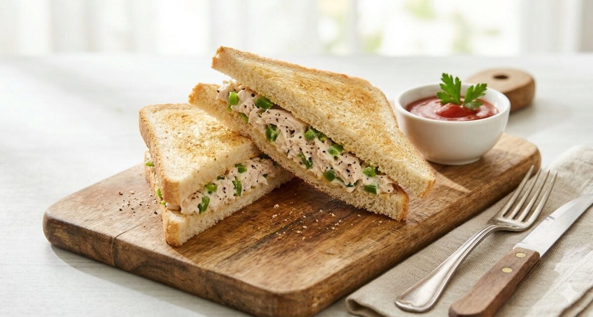 - சான்விச்சை முக்கோண வடிவில் வெட்டி, தக்காளி கெட்ச்அப் (Tomato Ketchup) அல்லது கிரீன் சட்னியுடன் பரிமாறவும்.