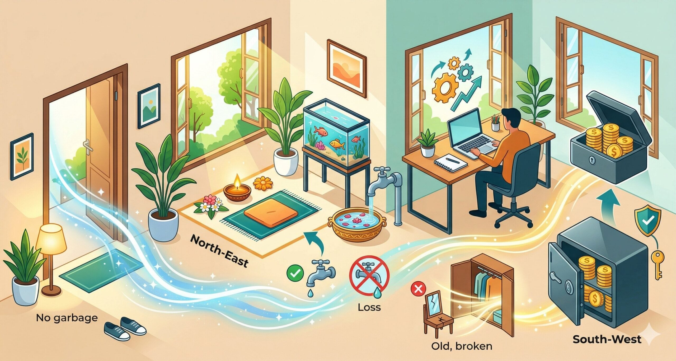 வாஸ்து படி North-East direction மிகவும் முக்கியம். இந்த இடம் clear-ஆவும் clutter இல்லாமலும் இருக்கணும்.