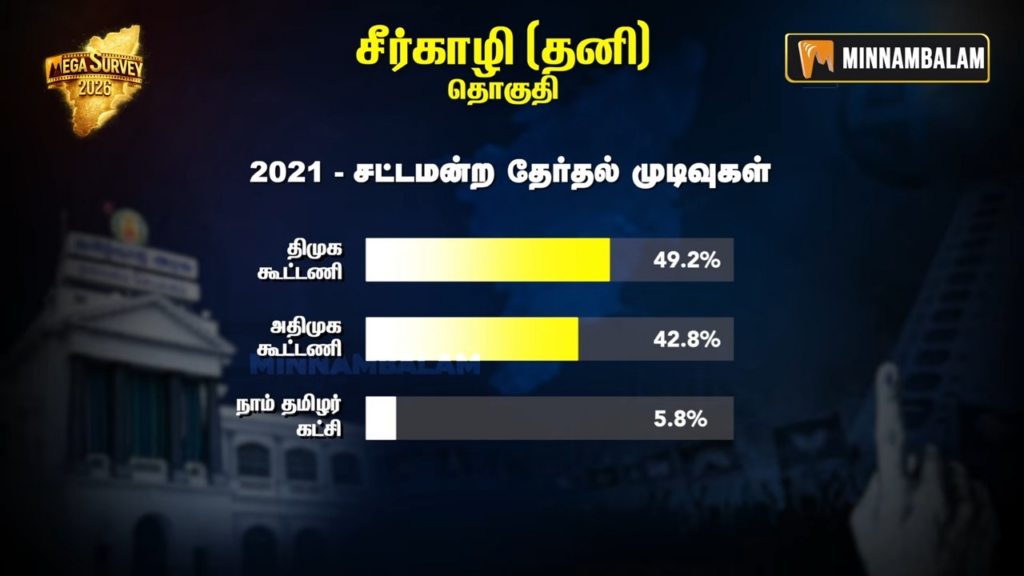 சீர்காழி தனித் தொகுதி… திமுக அதிமுக மாறி மாறி ஜெயிச்சுகிட்டு இருக்கிற தொகுதி இது.. திமுகவில சிட்டிங் எம்.எல்.ஏ. பன்னீர்செல்வம் 1989, 1996, 2006, 2021-ன்னு 4 முறை ஜெயிச்சாரு.