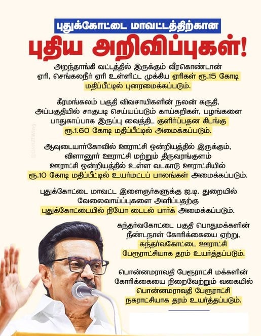 - அறந்தாங்கி வட்டத்தில் இருக்கும் வீரகொண்டான் ஏரி, செங்கலநீர் ஏரி உள்ளிட்ட முக்கிய ஏரிகள் ரூ.15 கோடி செலவில் புனரமைக்கப்படும்.