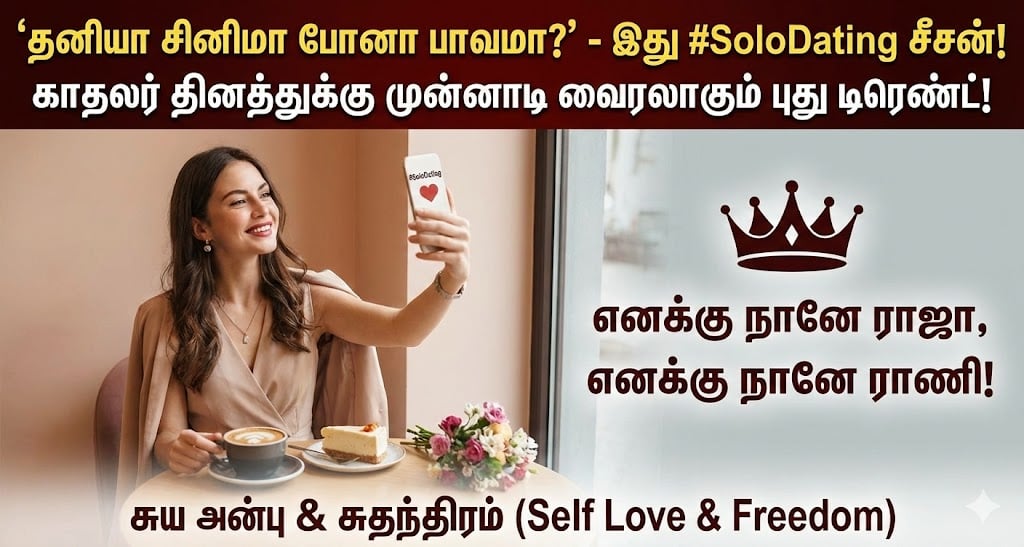 தனிமை இனிமை: பொது இடத்தில் தனியாக இருப்பது குறித்த கூச்சத்தை (Social Anxiety) உடைக்க இது உதவுகிறது. “தனியாக இருப்பது தோல்வி அல்ல; அது ஒரு சுதந்திரம்,” என்று கொண்டாடுகிறார்கள். காதலர் தினம் (பிப்ரவரி 14) நெருங்கும் வேளையில், “சிங்கிளாக இருக்கிறோமே,” என்று கவலைப்படாமல், “ஐ லவ் மீ” (I Love Me) என்று தங்களைக் கொண்டாடும் இந்த மாற்றம் ஆரோக்கியமானது.