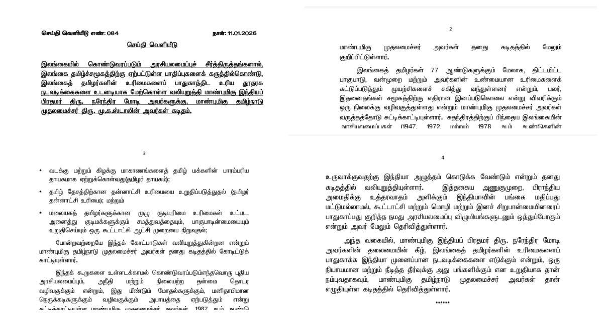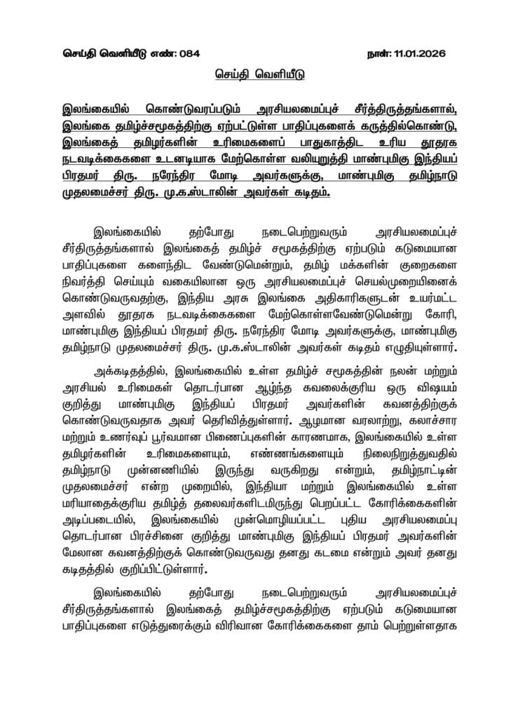 ”இலங்கையில் கொண்டுவரப்படும் அரசியலமைப்புச் சீர்த்திருத்தங்களால், இலங்கை தமிழ்ச் சமூகத்திற்கு ஏற்பட்டுள்ள பாதிப்புகளைக் கருத்தில்கொண்டு, இலங்கைத் தமிழர்களின் உரிமைகளைப் பாதுகாத்திட உரிய தூதரக நடவடிக்கைகளை உடனடியாக மேற்கொள்ள வேண்டும்” என்று பிரதமர் மோடிக்கு தமிழக முதல்வர் ஸ்டாலின் கடிதம் அனுப்பி உள்ளார்.