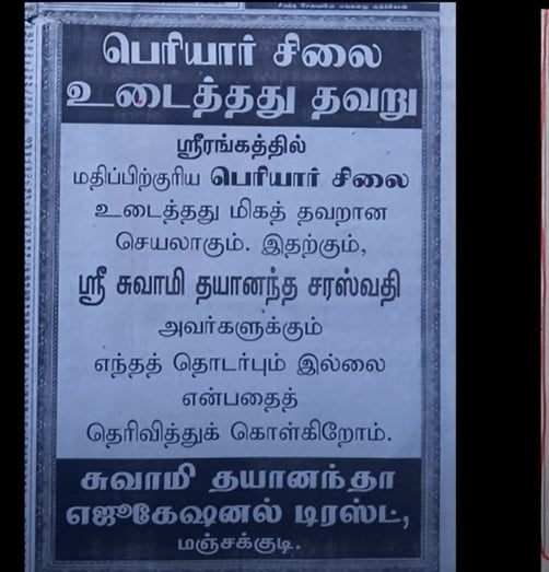 இதையடுத்து அப்போதைய பிராமண சங்க தலைவர் நாராயணன், ‘ ஸ்ரீரங்கத்தில் பெரியார் சிலை தாக்கப்பட்டதை பிராமணர் சங்கமும் கண்டிக்கிறது. இந்த சம்பவத்துக்கும் பிராமணர் சங்கத்துக்கும், பிராமணர் சமூகத்துக்கும் தொடர்பில்லை’; என்று அறிக்கை வெளியிட்டார். ஸ்ரீரங்கத்தில் பெரியார் சிலை தாக்கப்படுவதற்கு இரு தினங்கள் முன்பு ஸ்ரீரங்கத்துக்கு வந்த சாமியார் தயானந்த சரஸ்வதி, ‘பெரியார் சிலை ஸ்ரீரங்கத்தில் இருப்பது பாதுகாப்பானதாக இருக்காது’ என்று பேட்டி கொடுத்திருந்தார். எனவே தயானந்த சரஸ்வதி தூண்டிவிட்டுத்தான் அர்ஜுன் சம்பத் இதை செய்தார் என்று தயானந்த சரஸ்வதி மீதும் வழக்கு போட தயாரானது போலீஸ். ஏகப்பட்ட கல்வி நிறுவனங்களை நடத்திவரும் தயானந்த சரஸ்வதி தனக்கு சிக்கல் ஏற்பட்டுவிடக் கூடாது என்பதற்காக நாளிதழ்களில் எல்லாம், ‘பெரியார் சிலை தாக்கப்பட்டது தவறு’ என்று விளம்பரம் கொடுத்தார்.