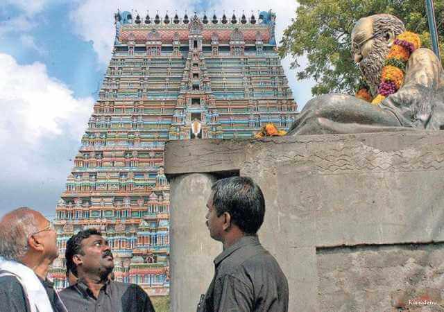 ஸ்ரீரங்கம் நகராட்சித் தலைவரும் காங்கிரஸ் பிரமுகருமான வெங்கடேஸ்வர தீட்சிதரிடம் அப்போதே சில பிராமணர்கள் சென்று, ‘ராமசாமி நாயக்கருக்கு ரங்கநாதர் முன்னாடி சிலை வைக்கலாமோ?’ என எதிர்த்திருக்கிறார்கள். அதற்கு வெங்கடேஸ்வர தீட்சிதர், ‘நம்பிக்கை உள்ளவா உள்ளே போயி ரங்கநாதனை சேவிக்கட்டும்., நம்பிக்கை இல்லாதவா ராமசாமி நாயக்கர் சிலைய சேவிச்சுட்டு போகட்டும். நமக்கென்ன?’ என்று சொல்லிவிட்டாராம்.