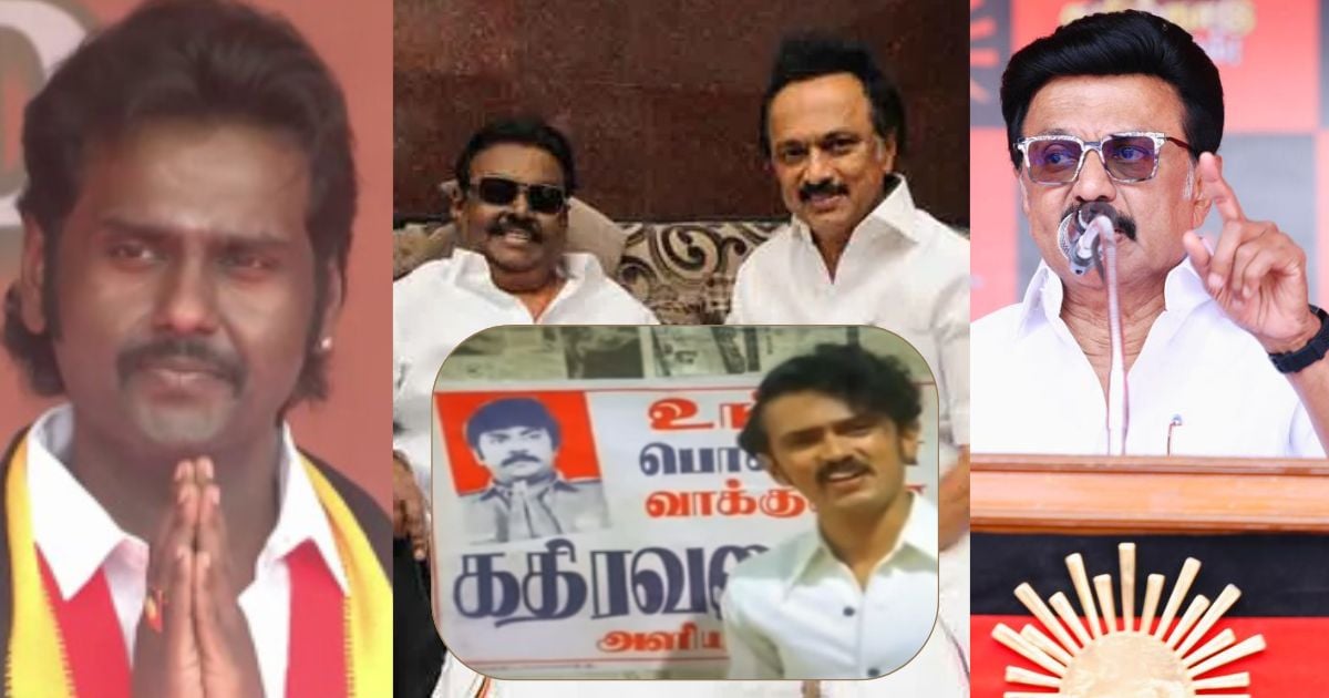 அந்தப் படத்தில் வேட்பாளராக இருக்கும் விஜயகாந்தை ஆதரித்து நான் பாடும் பாடல்.. கலைஞர் எழுதிய அந்தப் பாடல் கூட எனது மனதில் ஆழமாகப் பதிந்துள்ளது. ‘ஆற அமர கொஞ்சம் யோசித்துப் பாரு… அடுத்து வரும் தலைமுறையை சிந்திச்சுப் பாரு…’ என்று அந்தப் பாடல் வரும். இப்படி இவருடைய அப்பாவிற்கு நான் திரைப்படத்தில் ஓட்டு கேட்டு நடித்தேன். இன்று அவருடைய அன்பு மகனுக்கு முதலமைச்சராக நேரடியாக வாக்கு கேட்க வந்திருக்கிறேன்” என்று விஜயகாந்த் உடனான தனது நினைவுகளை முதலமைச்சர் மு.க. ஸ்டாலின் பகிர்ந்து கொண்டார்.