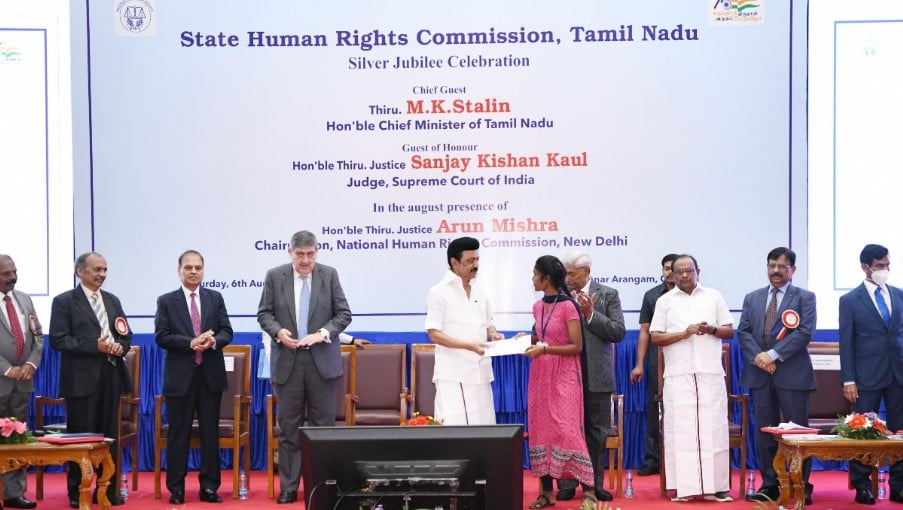 அரசியலமைப்புச் சட்டத்தின் மிக முக்கியமான அம்சமே மனித உரிமைகளை காப்பது தான் என்று கூறிய முதலமைச்சர் திமுக அரசு மனித உரிமைகள், பண்புகளை காப்பதில் எப்போதும் கண்ணும் கருத்துமாக இருக்கும் என்றார். மாநில மனித உரிமை ஆணையத்தின் வெள்ளிவிழா ஆண்டை முன்னிட்டு சில அறிவிப்புகளை முதலமைச்சர் வெளியிட்டார்.