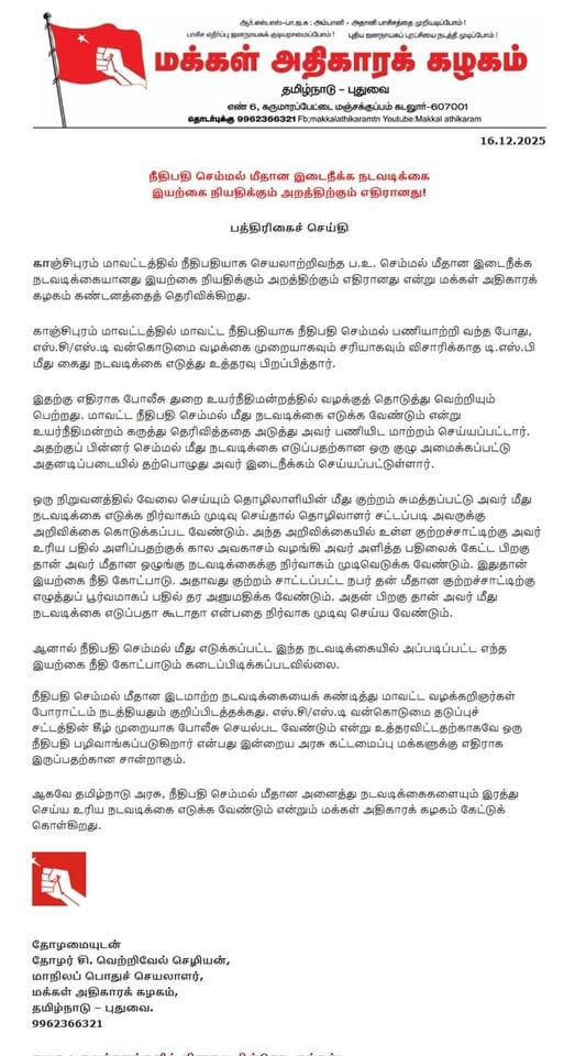 ஆகவே தமிழ்நாடு அரசு, நீதிபதி செம்மல் மீதான அனைத்து நடவடிக்கைகளையும் இரத்து செய்ய உரிய நடவடிக்கை எடுக்க வேண்டும் என்றும் மக்கள் அதிகாரக் கழகம் கேட்டுக் கொள்கிறது.