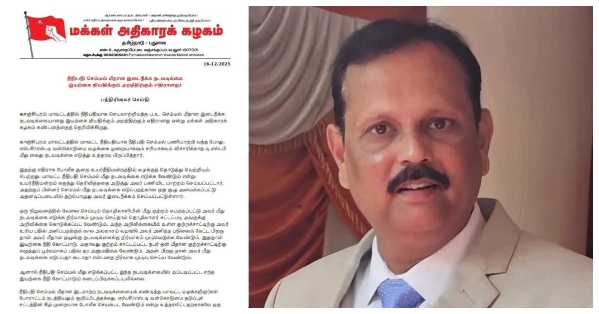 இது தொடர்பாக வெற்றிவேல் செழியன் வெளிட்ட அறிக்கை: காஞ்சிபுரம் மாவட்டத்தில் நீதிபதியாக செயலாற்றிவந்த ப.உ. செம்மல் மீதான இடைநீக்க நடவடிக்கையானது இயற்கை நியதிக்கும் அறத்திற்கும் எதிரானது என்று மக்கள் அதிகாரக் கழகம் கண்டனத்தைத் தெரிவிக்கிறது.