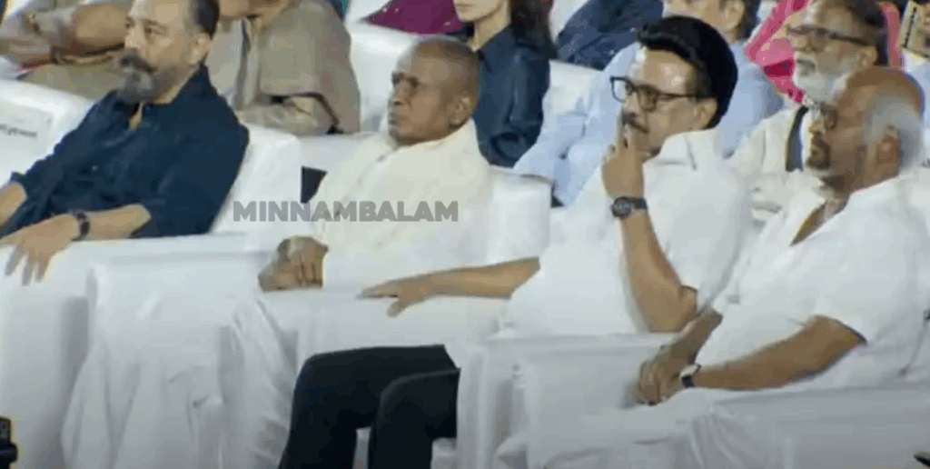 இதற்கிடையே ”இந்த விழாவில் பாடப்படும் பாடல்கள் அனைத்தும் என்னைப் போன்ற இளையராஜாவின் மிகப்பெரிய ரசிகரான நம் முதல்வர் ஸ்டாலின் கொடுத்த பாடல்களின் லிஸ்ட்தான்” என நடிகரும் மாநிலங்களவை எம்.பி.யுமான கமல்ஹாசன் போட்டுடைக்க அரங்கில் இருந்த அனைவரும் ஆர்ப்பரித்து கைத்தட்டி மகிழ்ந்தனர்.