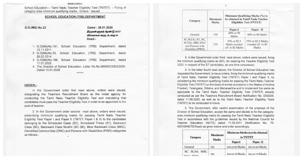 ஆசிரியர் தகுதித் தேர்வுகளில் SC/ST/BC/MBC பிரிவ்னருக்கான தகுதி மதிப்பெண்களை அதிரடியாகக் குறைத்து தமிழ்நாடு அரசு அரசாணை வெளியிட்டுள்ளது.