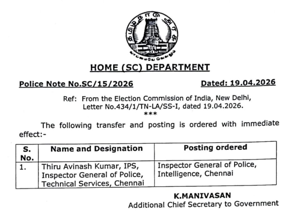 இந்நிலையில், தமிழ்நாடு உளவுத்துறை ஐஜியாக இருந்த செந்தில் வேலை தேர்தல் ஆணையம் மாற்றி உத்தரவிட்டுள்ளது. இதைத் தொடர்ந்து, இன்று (ஏப்ரல் 19) தமிழ்நாடு உளவுத்துறை ஐஜியாக அவினாஷ் குமார் ஐபிஎஸ் நியமனம் செய்யப்பட்டுள்ளார். உளவுத்துறை ஐஜியாக அவினாஷ் குமார் நியமனம் உடனடியாக நடைமுறைக்கு வருவதாக தேர்தல் ஆணையம் அதிரடியாக அறிவித்துள்ளது.