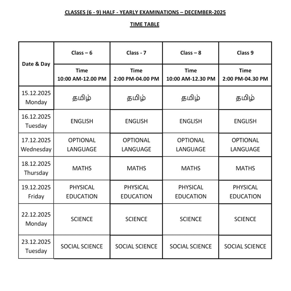 தமிழகத்தில் 6-ம் வகுப்பு முதல் 12-ம் வகுப்பு வரையிலான மாணவர்களுக்கான அரையாண்டு தேர்வு அட்டவணை வெளியிடப்பட்டுள்ளது.