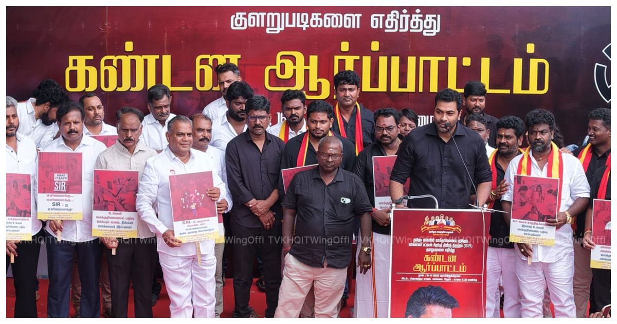 இந்திய தேர்தல் ஆணையத்தின் வாக்காளர் பட்டியல் சிறப்பு தீவிர திருத்தம் SIR-க்கு எதிராக தமிழக வெற்றிக் கழகம் சார்பில் இன்று நவம்பர் 16-ந் தேதி தமிழகம் முழுவதும் கண்டன ஆர்ப்பாட்டம் நடைபெற்று வருகிறது.