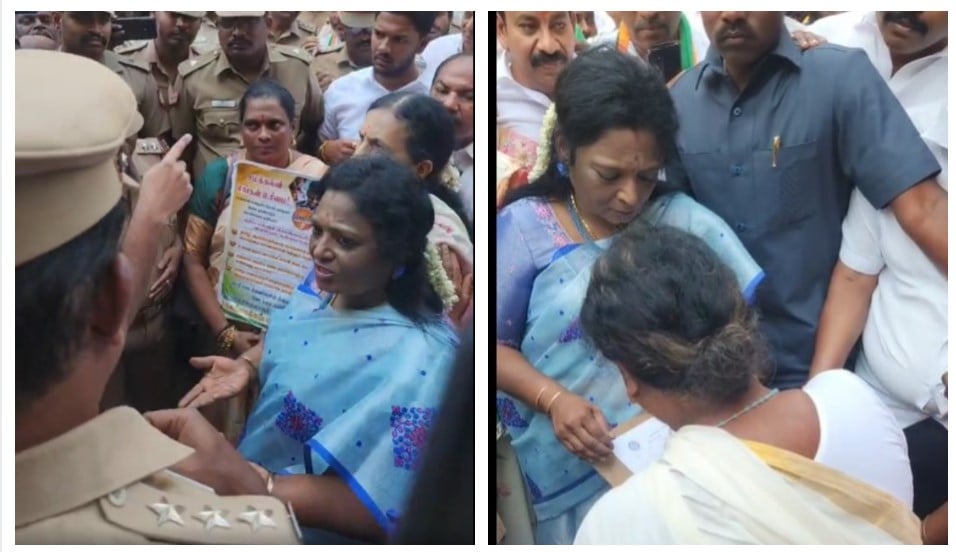 மும்மொழிக் கொள்கைக்கு ஆதரவாக தமிழக பாஜக மூத்த தலைவரும் முன்னாள் ஆளுநருமான தமிழிசை செளந்தரராஜன் கையெழுத்து இயக்கம் நடத்தியபோது, போலீசாருக்கும் தமிழிசைக்கும் இடையே இன்று (மார்ச் 6) வாக்குவாதம் ஏற்பட்டதால் பரபரப்பு நிலவியது. Tamilisai Soundararajan argue police