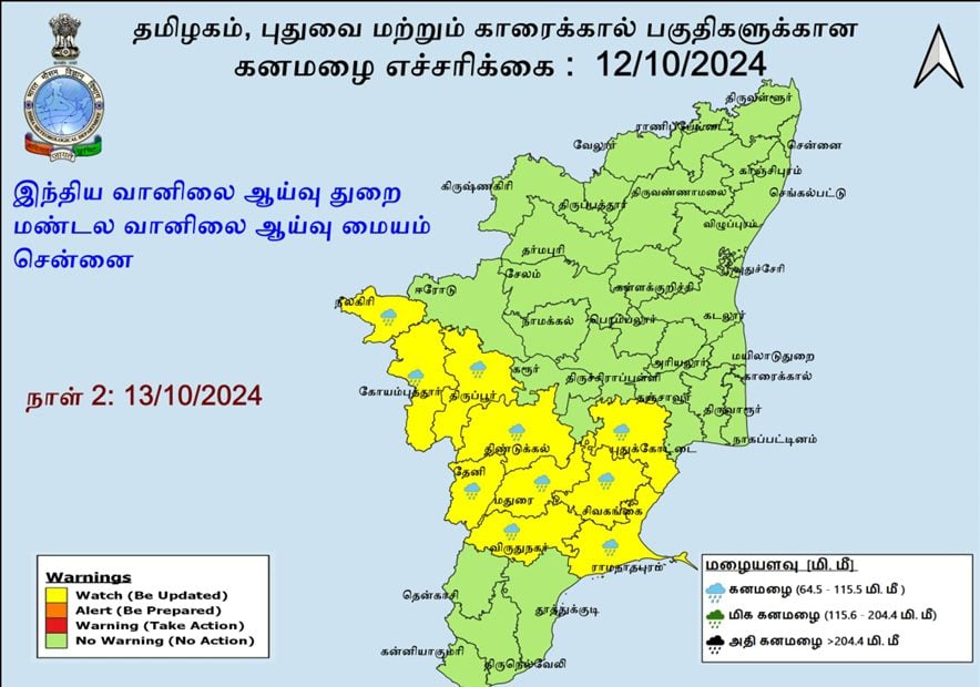 13.10.2024: திருப்பூர் மற்றும் கோயம்புத்தூர் மாவட்ட மலைப்பகுதிகள், நீலகிரி, திண்டுக்கல், தேனி, மதுரை, விருதுநகர், புதுக்கோட்டை, சிவகங்கை மற்றும் இராமநாதபுரம் மாவட்டங்களில் ஓரிரு இடங்களில் கனமழை பெய்யவாய்ப்புள்ளது.