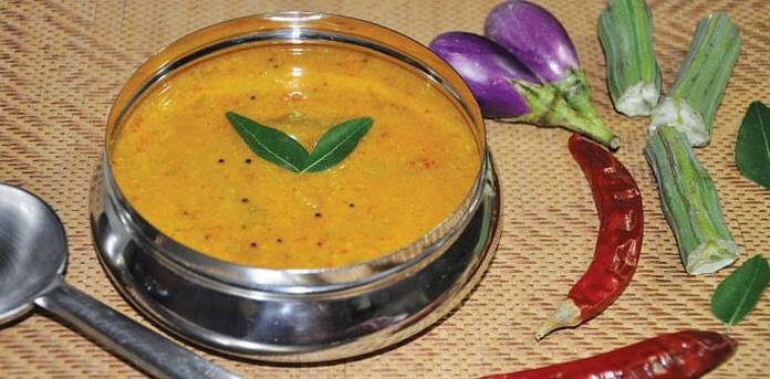 தேங்காய்த் துருவல், மஞ்சள்தூள், சின்ன வெங்காயம், காய்ந்த மிளகாய் சேர்த்து தண்ணீர்விட்டு அரைத்துக்கொள்ளவும். ஒரு குழம்பு பாத்திரத்தில் சிறிதளவு தண்ணீர் ஊற்றி நறுக்கிய காய்கறிகளைச் சேர்த்து, அடுப்பை மிதமான தீயில் வைத்து வேகவிடவும். புளியைத் தண்ணீரில் 15 நிமிடங்கள் ஊறவைத்து அரை கப் தண்ணீர் ஊற்றிக் கெட்டியாகக் கரைத்துக் கொள்ளவும். புளிக்கரைசலோடு உப்பு, பெருங்காயத்துண்டு, அரைத்த தேங்காய் விழுதைச் சேர்த்து நன்கு கலந்துகொள்ளவும். காய்கறிகள் நன்கு வெந்ததும், கரைத்து வைத்துள்ள கலவையைச் சேர்த்து நன்கு கலந்துகொள்ளவும். குழம்பு லேசாகக் கொதித்து மேலே பொங்கி வந்ததும் கிள்ளிய கறிவேப்பிலை சேர்த்து இறக்கவும். வாணலியில் எண்ணெய்விட்டு சூடானதும் வெந்தயம் போட்டு சிவந்ததும் கடுகு, உளுந்து தாளித்து, பொடியாக நறுக்கிய சின்ன வெங்காயம் சேர்த்து நன்கு பொன்னிறமாக வதக்கி, சூடான குழம்பில் சேர்த்துக் கலந்துகொள்ளவும்.