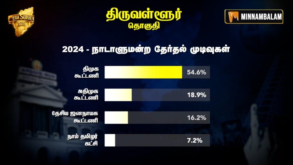 திருவள்ளூர் தொகுதியை பார்த்தோம்னா, சிட்டிங் எம்.எல்.ஏ. வி.ஜி, ராஜேந்திரன் மீண்டும் களம் காண்கிறார். போன 2021-ல் தோல்வி அடைந்த அதிமுக முன்னாள் அமைச்சர் பிவி ரமணா மீண்டும் அதிமுக வேட்பாளராக போட்டியிடுகிறார். 2001-ல் இருந்து விஜி ராஜேந்திரனும் 2006-ல் இருந்து பிவி ரமணாவும் தேர்தல் களத்தில் இருக்கிறாங்க.. இந்த முறை களம் எப்படி இருக்கிறதுன்னா திமுகவுக்கு ரொம்பவே சாதகமானதாக இருக்கிறதுன்னு சொல்லலாம்.