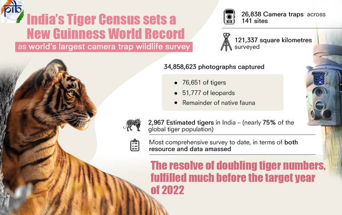 புலிகளின் எண்ணிக்கையை கேமரா மூலம் எடுக்கப்பட்ட கணக்கெடுப்பு உலகின் முதல் சாதனையாகக் கருதப்பட்டு கின்னஸ் புத்தகத்தில் இந்தியா இடம் பெற்றுள்ளது.